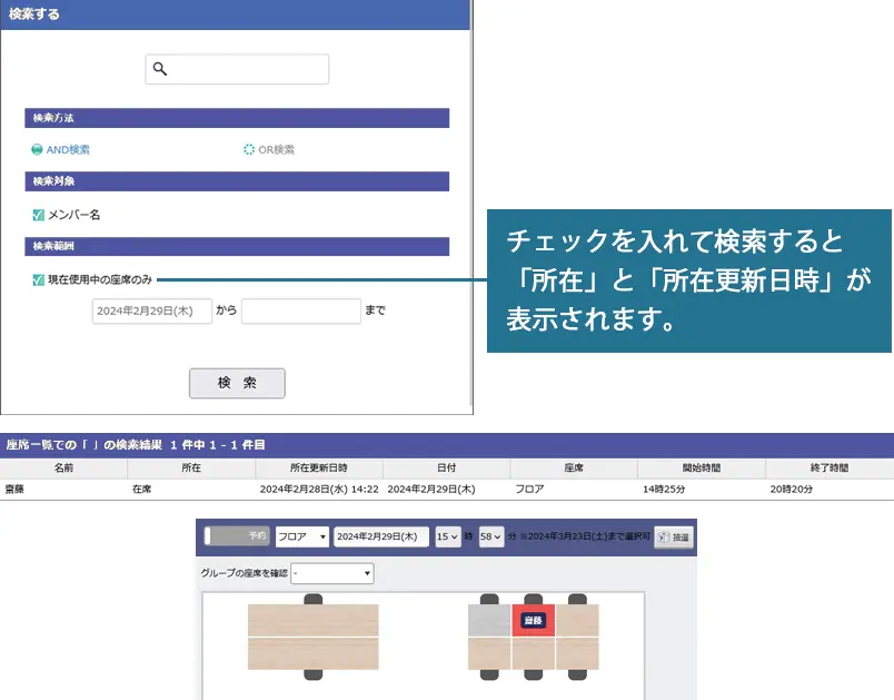 「現在使用中の座席のみ」にチェックを入れて検索することで、席を予約しているメンバーの所在と所在変更日時が検索結果に表示されるので、探しているメンバーを見つけやすくなります。