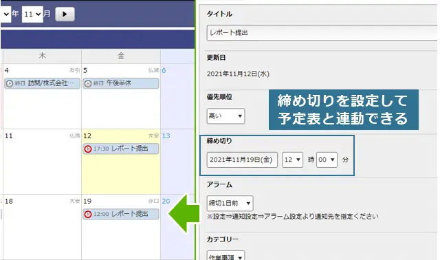 ToDoに締切日や優先度を設定すると、自動で予定表に表示することができます。