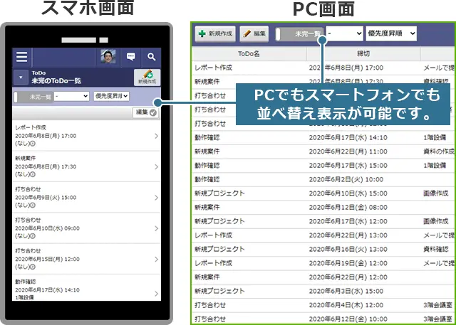 TimeBizのToDoは名称・締め切り・優先度の並べ替えで、順番を変更できます。